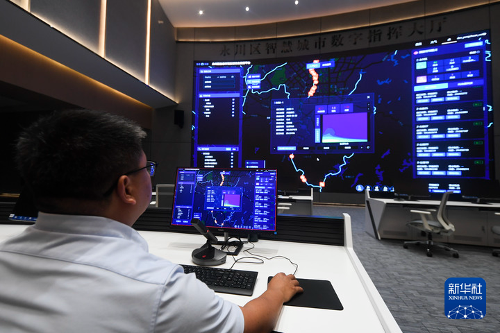 在永川區(qū)數(shù)字化城市管理指揮中心,工作人員正進(jìn)行環(huán)境監(jiān)測(cè)及分析。新華社記者王全超 攝